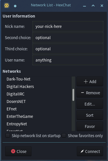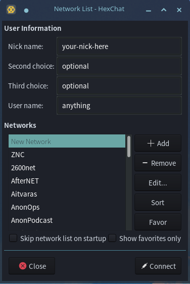 Start Hexchat and menu will open with several options.