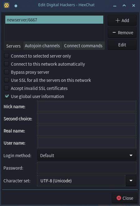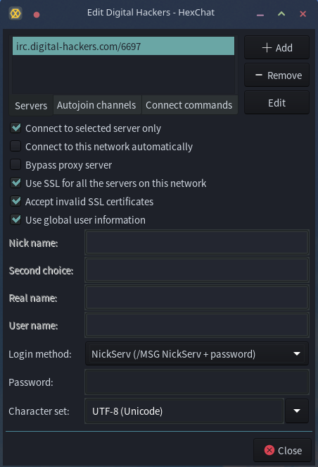 Configuring Hexchat to connect to the Digital Hackers network: